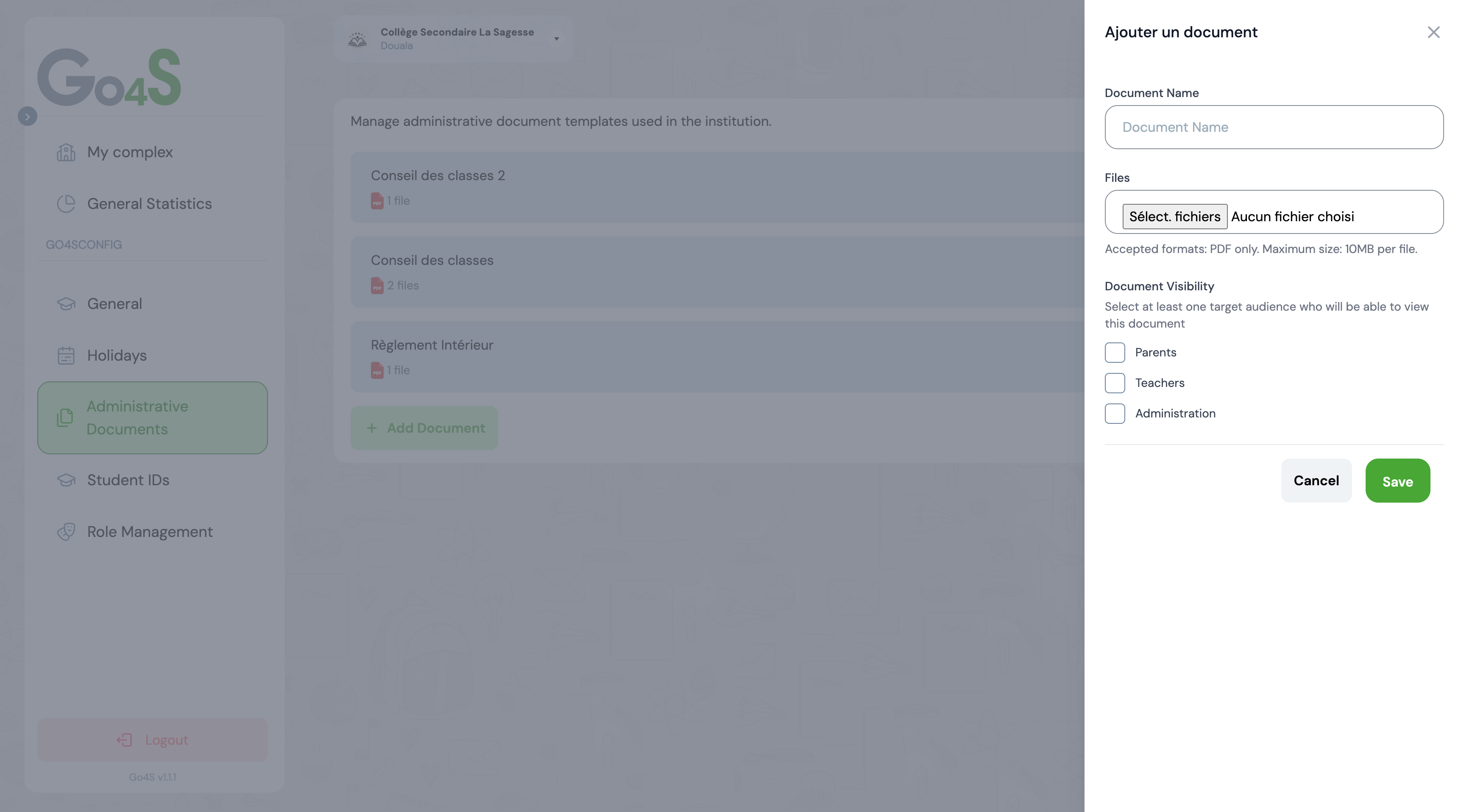 Administrative document visibility is controlled by the "Visibility" field you define when creating the document. You can choose to make a document visible to Parents, Teachers, Administration, or a combination of these three groups. Only people belonging to the selected groups and with appropriate permissions will be able to view the document. You can manage general permissions in the "Roles and Permissions" section of GO4SCONFIG.