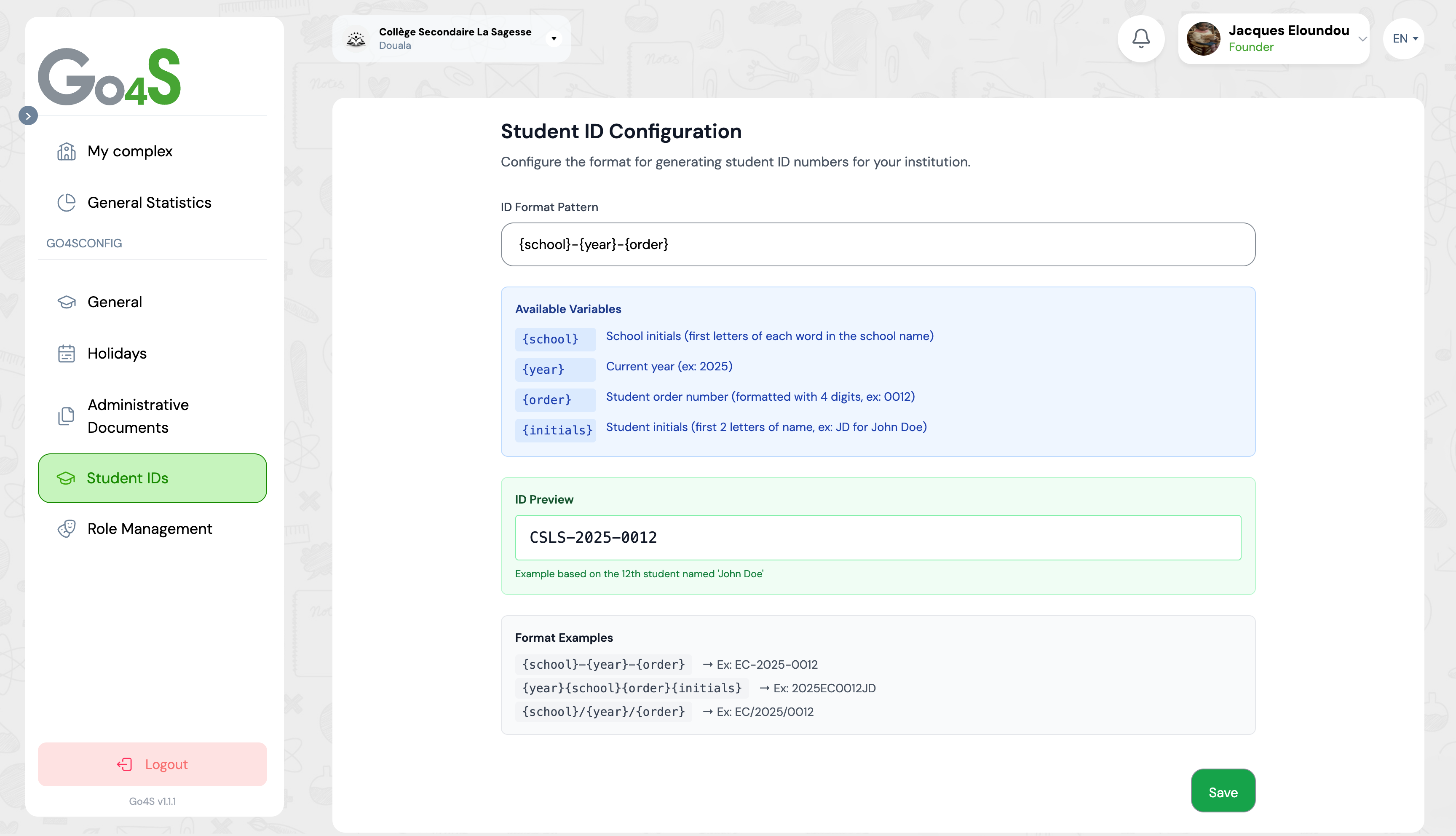 Before saving your format, GO4SCHOOL displays a real-time preview of the ID that will be generated for the next enrolled student.