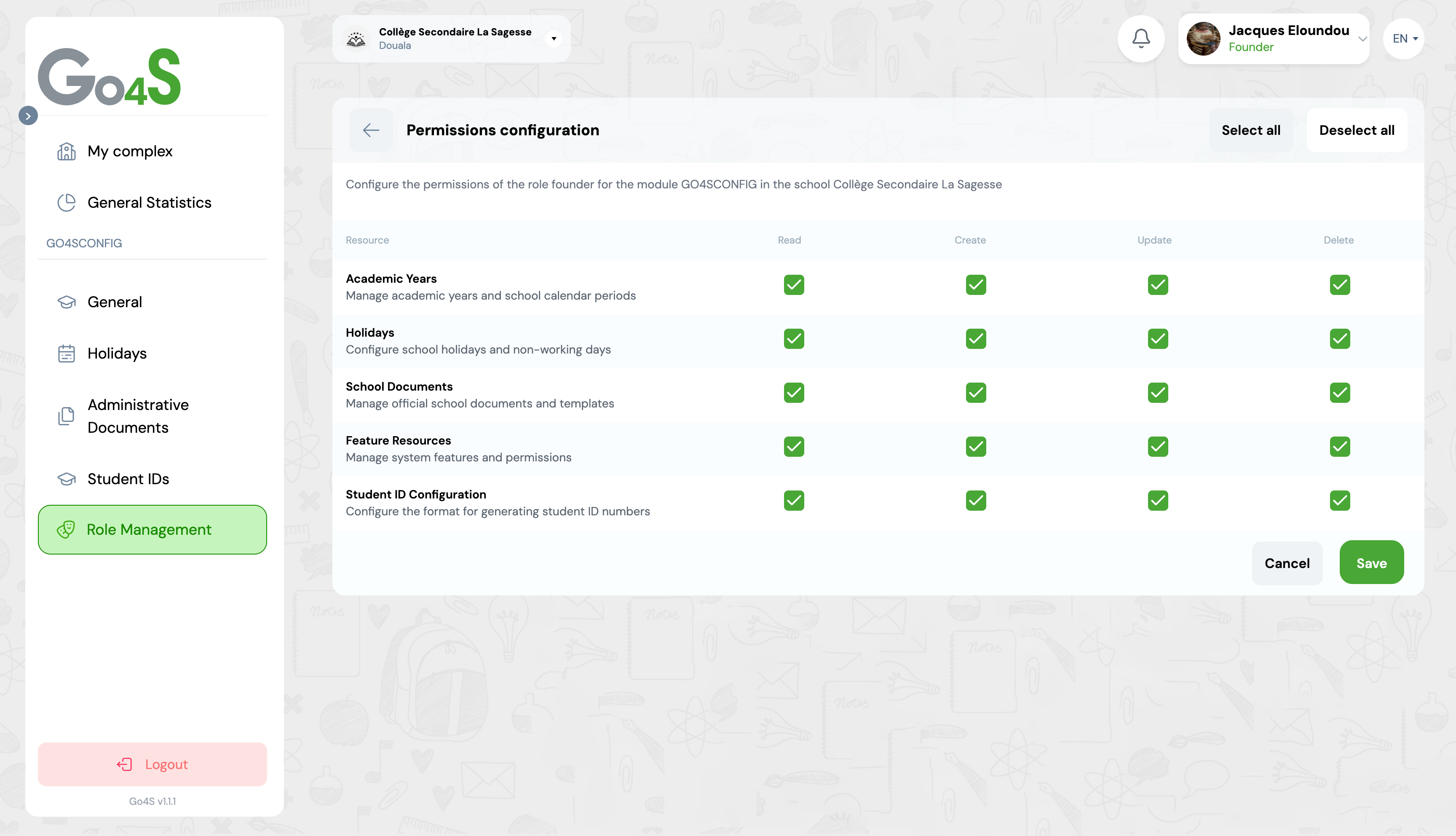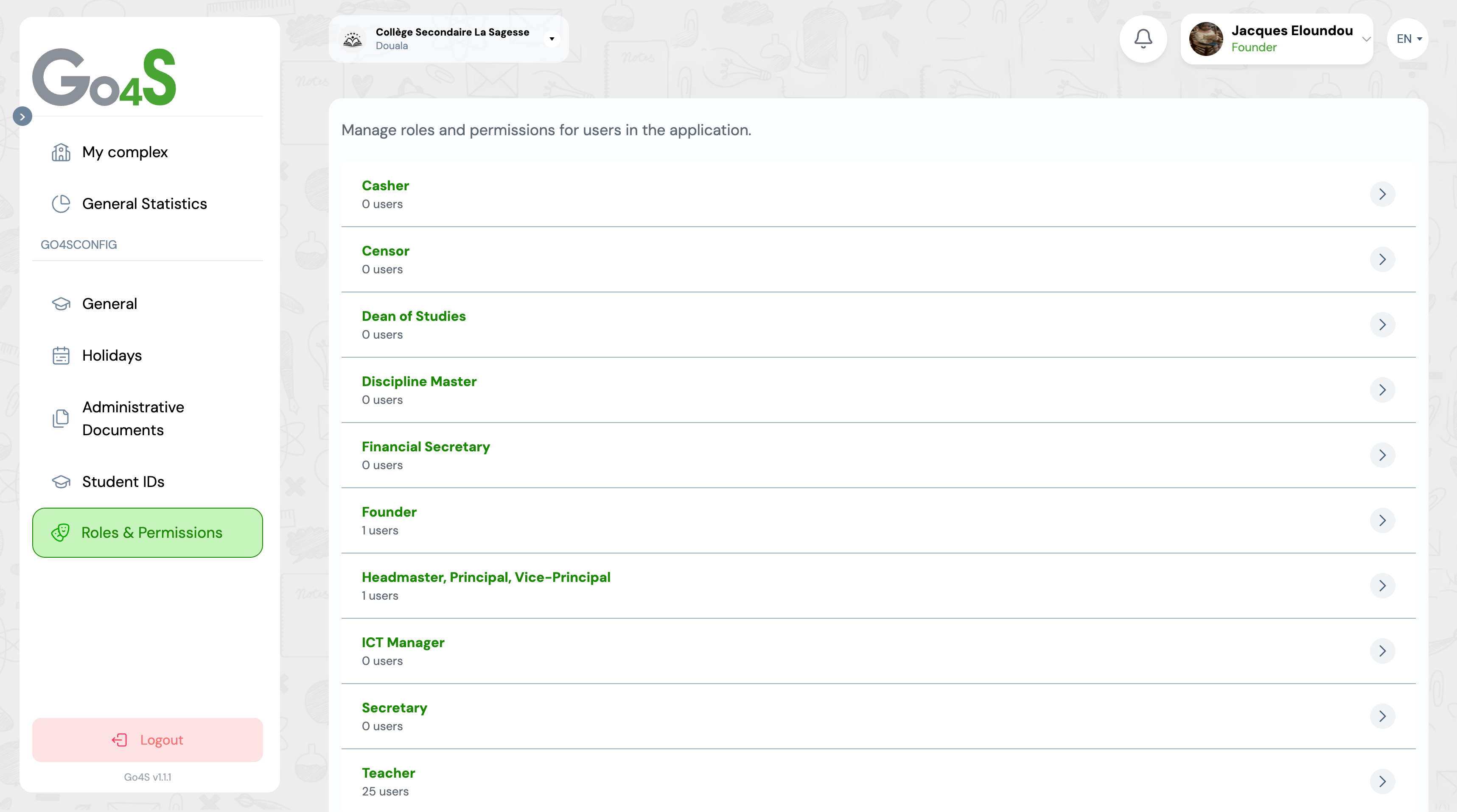 GO4SCHOOL's role and permission system allows you to finely control who can do what in your institution. Each staff member can have one or more roles, and each role defines specific permissions for each module and resource of the platform.