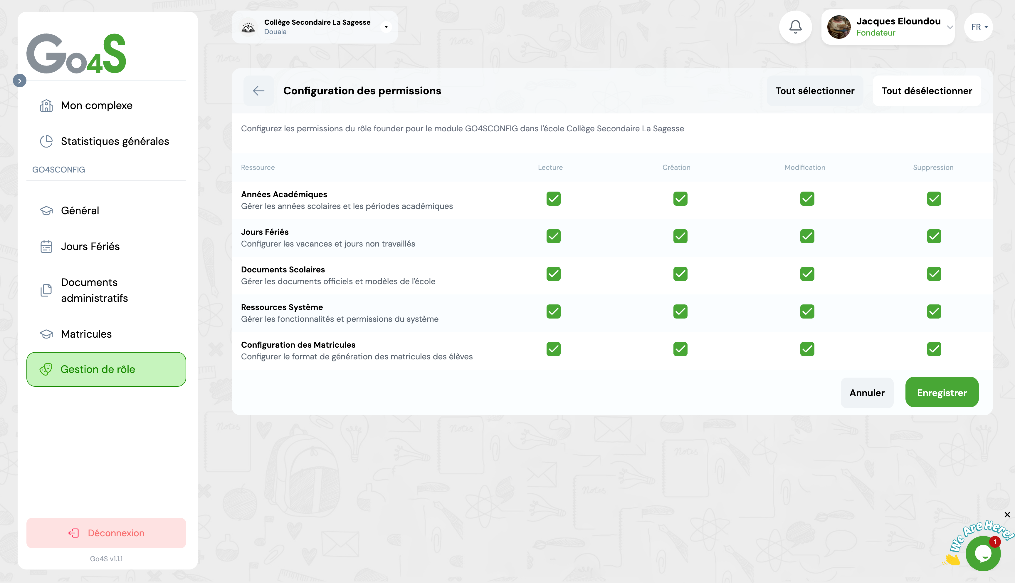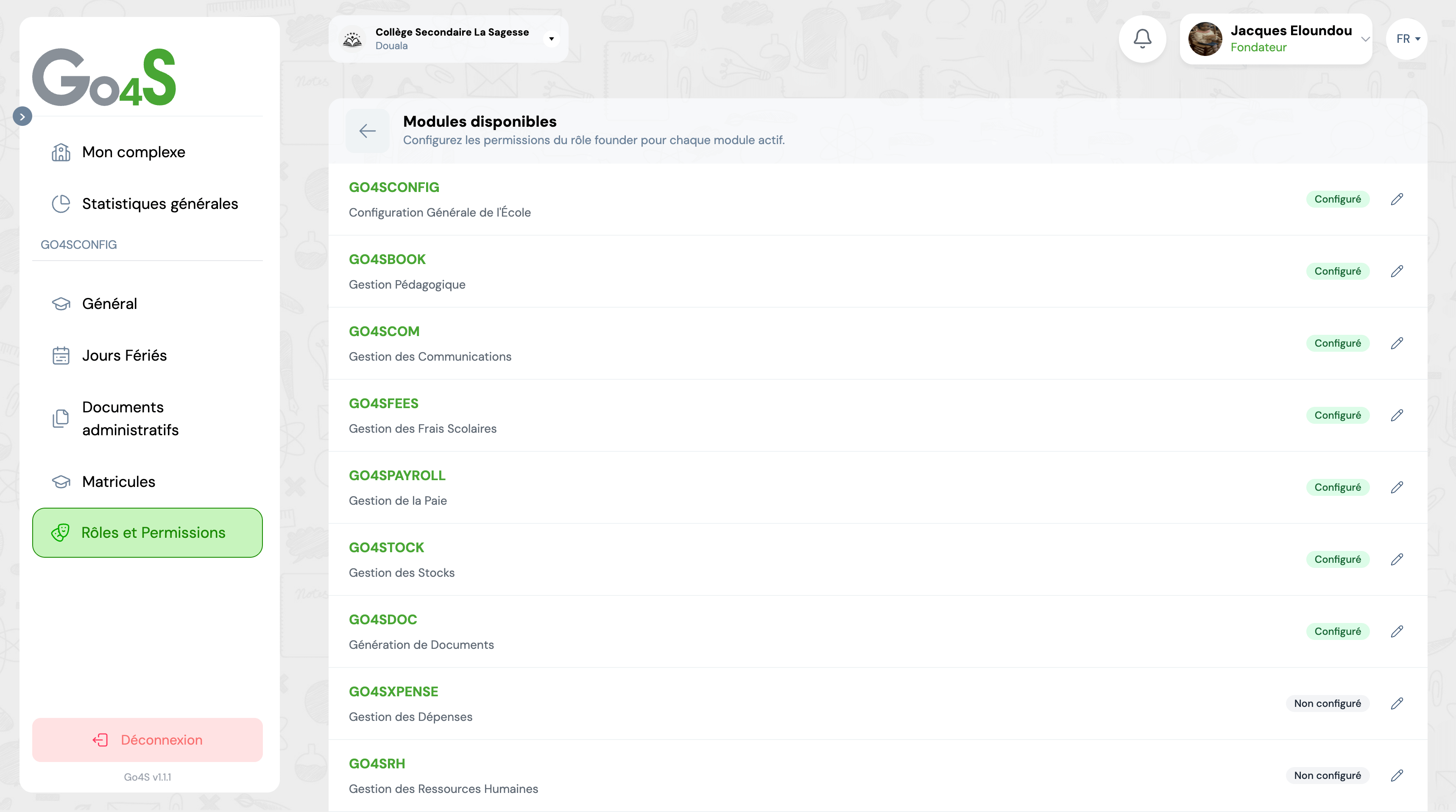 Le système de rôles et permissions de GO4SCHOOL vous permet de contrôler finement qui peut faire quoi dans votre établissement. Chaque membre du personnel peut avoir un ou plusieurs rôles, et chaque rôle définit des permissions spécifiques pour chaque module et ressource de la plateforme.