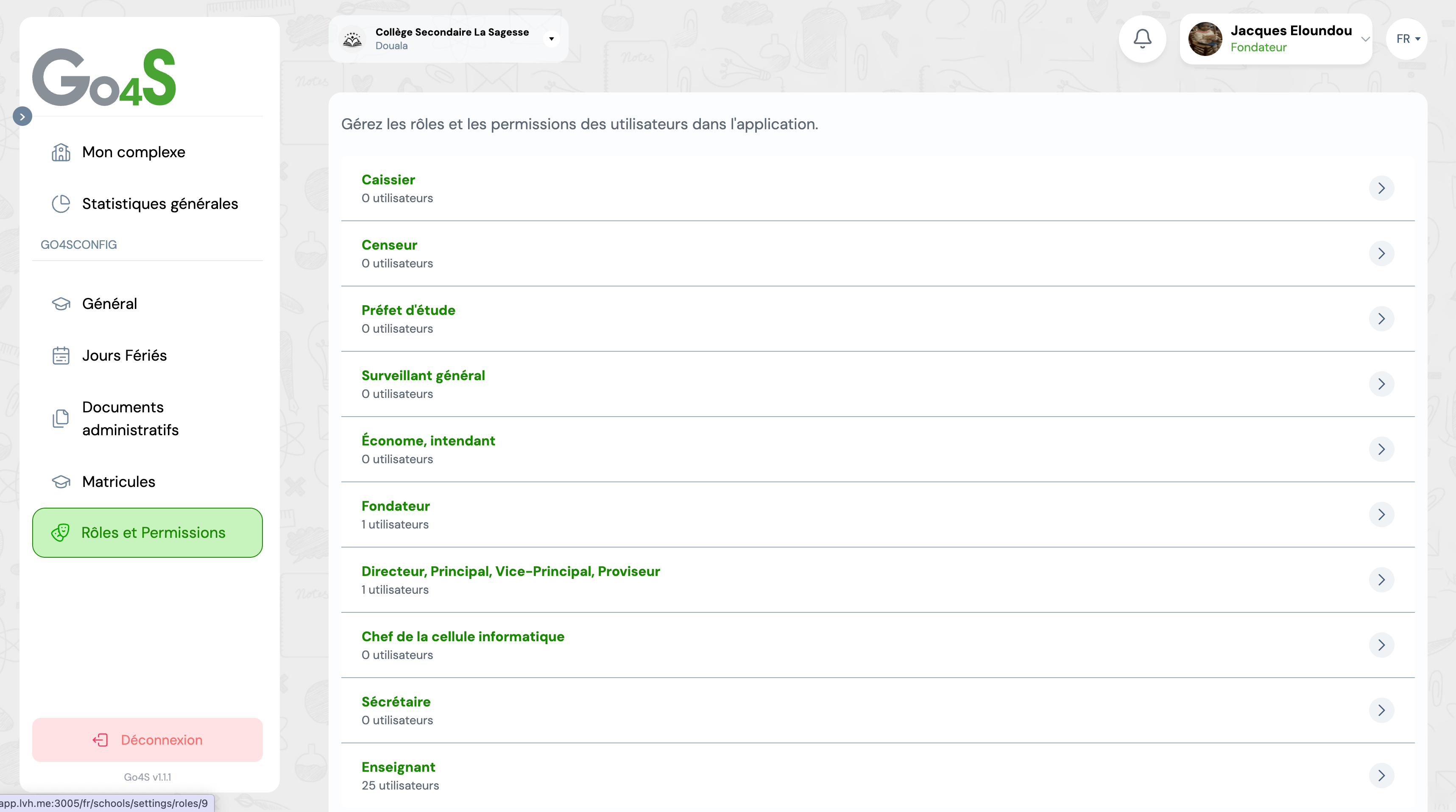 Actuellement, les rôles prédéfinis (Directeur, Enseignant, Secrétaire, Comptable, etc.) couvrent la plupart des besoins courants. La création de rôles personnalisés n'est pas encore disponible dans l'interface utilisateur. Si vous avez besoin d'un rôle spécifique, contactez le support GO4SCHOOL qui pourra vous aider à le créer ou adapter les rôles existants à vos besoins.